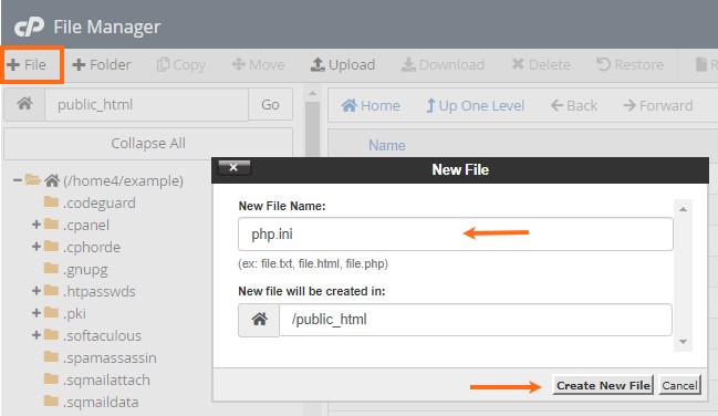 - In the pop-up box, enter php.ini in the New File Name field. Make sure the root directory is in the bottom box.