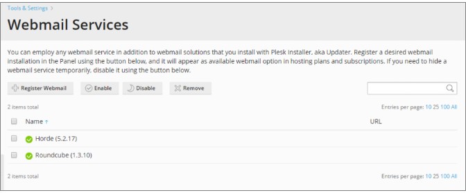 By default, Horde and RoundCube webmails are installed on Plesk for Linux, and only Horde is installed on Plesk for Windows. Plesk for Windows also supports the following webmail clients: