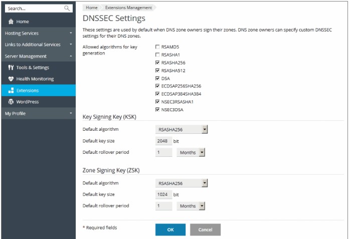 The default DNSSEC settings are located in Tools & Settings > Extensions > DNSSEC. You can change the default policy for generating Key Singing Key (KSK) and Zone Signing Key (ZSK) pairs.