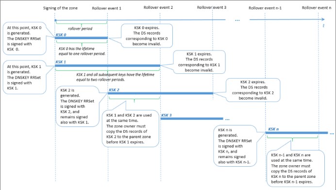 The domain zone owner is notified about the rollover and about the need to update the DS records in the parent zone. The DS records become obsolete when the oldest KSK expires and the newest KSK is generated (for example, at rollover event 2 in the scheme below). If the domain zone owner did not update the DS records in the parent zone, then at the end of one rollover period after the notification the domain stops resolving.