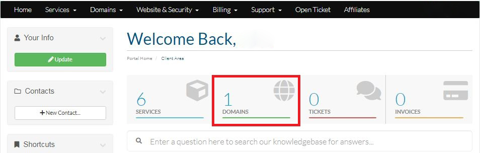 Login to your Hosting Walay client portal and click on the Domains option as displayed by the Red Box below.