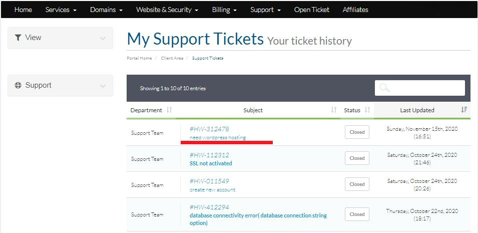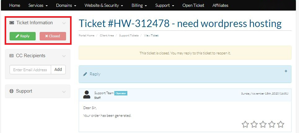 Login to your Hosting Walay client portal and click on the Tickets option as displayed by the Red Box below.