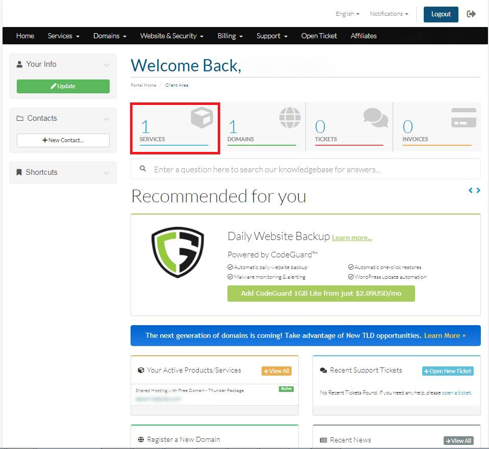 After that you will observe your hosting services you have own and which is currently active in your account. Click on the WHITE PORTION of any of your services as shown in the image with the Red Box.