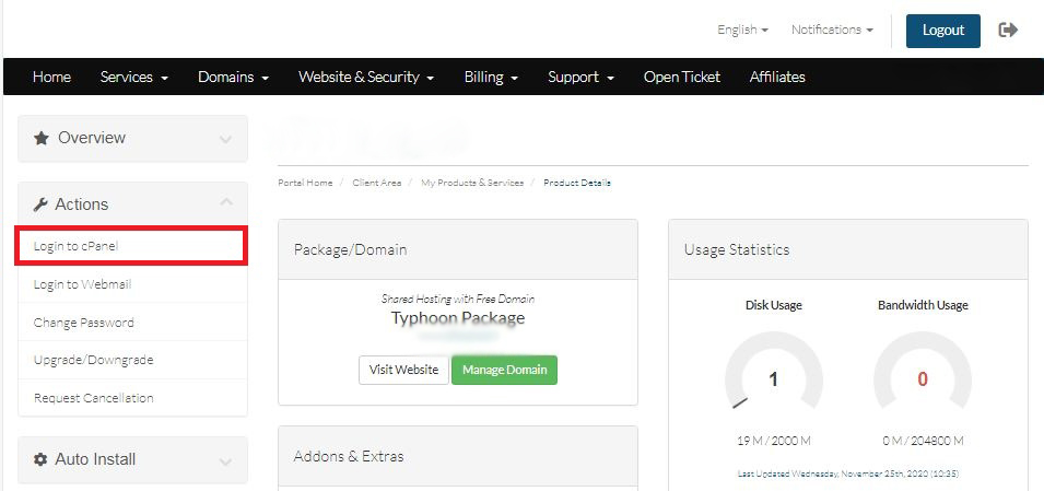 Click on the Login to cPanel option located in the top left side of the Actions menu as denoted by the Red Box in the image.